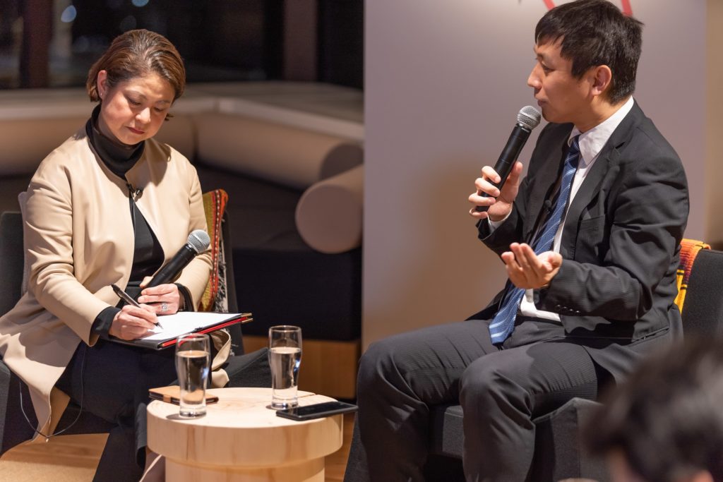ライトアップされた東京タワーなどの夜景をバックに、十数名がお飲み物を片手に集う中、株式会社イスラテック 代表取締役CEO加藤清司さんとZENMONDO代表の伊藤(荒井)三奈との対談が繰り広げられました。